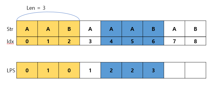 AAB로 동일하니, len을 3으로 갱신하고 lps[6]은 3이 된다.