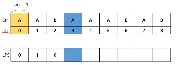 AA, 접미사는AB로 서로 다르다. - 그럼 다시 LPS[Len - 1]을 보면 기존에 Len은 1이였으므로, LPS[0], 0이 Len이 된다.