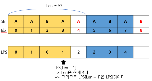 - 위에서 틀렸을 경우, 우리는 Len값이 LPS[len - 1] 값이 된다고 설명하였다.