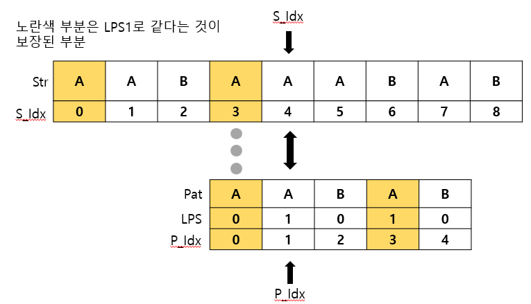 "알려진"공통 부분은"굳이 확인하지 않고 넘어가도"괜찮다는 뜻이다. - 그래서 Pattern 문자열의 LPS[P_index - 1] 부터 다시 검사하는 것이 가능하게 성립한다.
