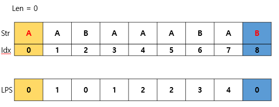 A,B로 각각 다르기 때문에, Len은 0으로 끝나고 LPS[8]은 0으로 LPS, 실패배열 구하는 로직이 끝이 난다.