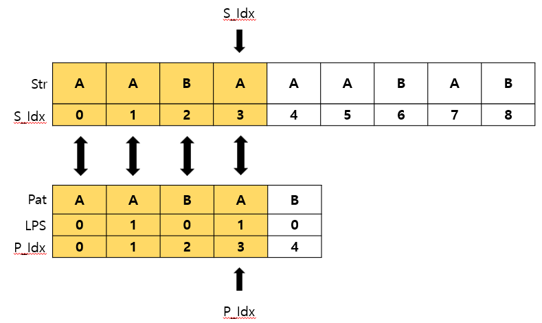 - 만약 Str과 Pat의 인덱스에 해당하는 글자가 같다면 인덱스가 각각 증가한다.