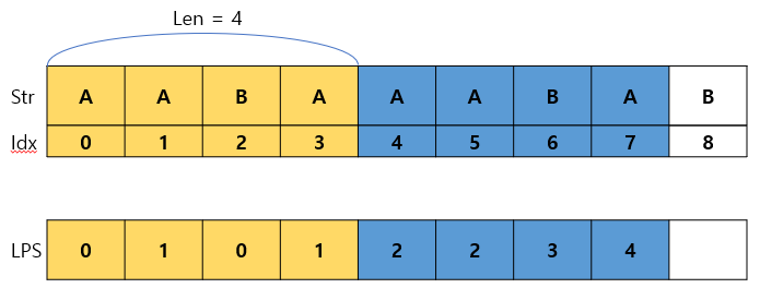 AABA로 동일하니, len을 4로 갱신하고 lps[7]은 4가 된다.