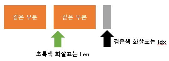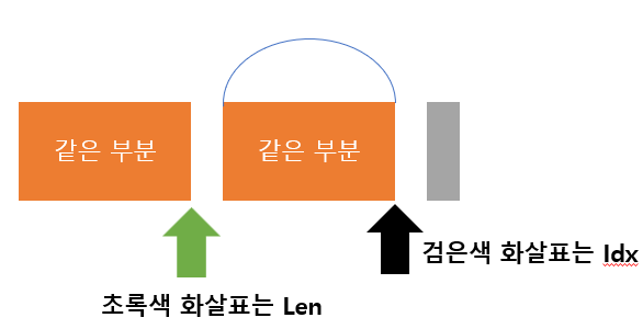 - 위 이미지에서는 틀리기 직전 최대 접두 접미사의 길이는 오렌지색 도형의 가로길이 == Len - 1 값
