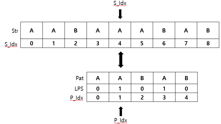 - 우리가 탐색하려는 문자열 STR과 찾으려는 패턴 PATTERN 각각 인덱스를 따로 관리한다.